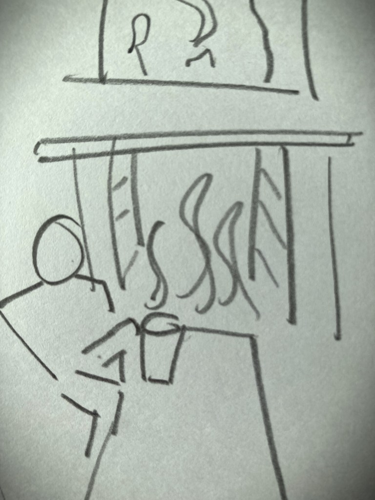 The man sits with knees wide apart and a hand resting on his pint glass. He stares into the flames and their orange glow glints in his one good eye. His expression is full of intent. I wonder what he is thinking. Dark deeds, vengeance, hatred or is he brewing upon things lost – love, family, children, money, a home.