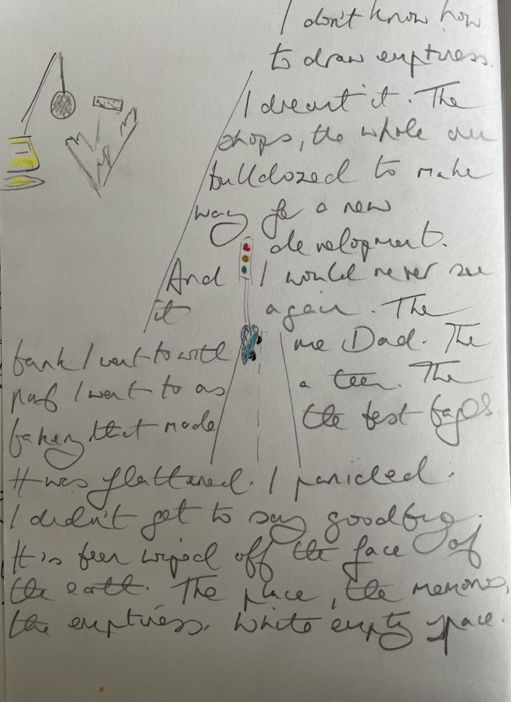 In my dream I started rationalising the devastation to soothe my pain which is something I don’t often do in dreams. I told myself – ‘It had to go. It was built in the ’60s. It wasn’t safe anymore. Things move on. Make way for the new.’